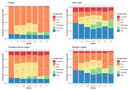 There is a presence of covariances between the omics. However, it is only in the grain yield that a positive covariance was found when combining genomics with either DNA methylation (ML,G,M) or gene expression data (ML,G,T) (Table S4). Here the combination of genomic and gene expression data (ML,G,T) increased the variance explained. In all other traits, the variance explained is the same as with only one omic data set (ML,G, ML,M, ML,T) or even less as in nitrogen uptake and TKW, where gene expression data explains more variance without the addition of genomic data (ML,T). Nevertheless, adding the three layers of omics together (ML,G,M,T in Table S4) explained the highest PV2 of all the models for grain yield, TKW, and nitrogen uptake. Only for protein content was ML,T the most accurate. In this model, most of the variance is explained by the line effect, which is undesired with genomic prediction. In genomic prediction, you want the genomic information to explain more in order to rely on your SNPs. Therefore, ML,G,M,T was still the best. Selecting ML,G,M,T as the best was based on the high PV2 of the traits in the model, as high PV2 gives higher prediction accuracy [48,49]. In Wang et al. [21], the inclusion of gene expression data did not improve predictability in hybrid rice for yield, TKW, number of grains per panicle, or number of tillers per plant, but instead, predictability decreased. Our findings show the opposite for protein and nitrogen uptake in barley, agreeing with studies in maize [19].
