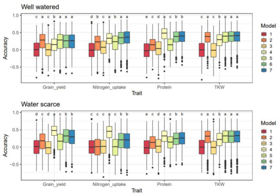Depending on trait and cost, it is crucial to look at the distribution of the variance explained and the accuracy of a model. When it comes to TKW, the distribution of variance explained and the accuracy appears to be good enough only with genomic SNP data (ML,G), whereas, for grain yield and nitrogen, all three omics (ML,G,M,T) would be the best options. For protein, genomic and gene expression information (ML,G,T) would be sufficient for a good prediction. The gene expression and DNA methylation data only describe the environment and time-point from which they were sampled. The choice of omics for each trait appears to be the same for both treatments, as the Tukey test in Figure 6 shows no significant difference in the accuracies between the best models within each treatment. The TP should be maintained and optimized with information from recent breeding cycles to keep a high prediction accuracy [70].
