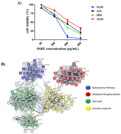 Pathway analysis of Transcriptional effect of SSRE extract. (A) Cytotoxicity assay of Sarcopoterium spinosum L. with different cell lines. A20 mouse lymphoma (black), HL-60 human promyelocytic leukemia (blue), NB4 cells (green), and A549 human lung cancer cells (red) were incubated with a range of concentrations of SSRE for 24 h, and an XTT assay was performed. (B) Comparative Gene Set Enrichment Analysis (GSEA) of extract effect on lung (A549) and Mouse Adipocyte (3T3) cell lines. In the middle, the number of common pathways that have been found in both cell lines after extract treatment has been described. (C) RNAseq-based protein-protein interaction networks of hub genes obtained from the STRING Database (interaction score > 0.9). (Isolated protein nodes were not depicted in Figure). The Intensity of nodes between genes represents the strength of the nodes and the interaction between proteins.