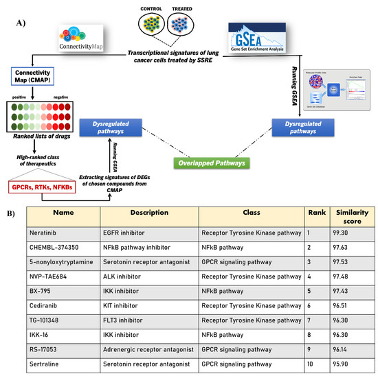 Integration analysis of GSEA-CMAP. (A) Graphical summary of the GSEA-CMAP integration analysis. (B) Top-ranked 10 CMAP compounds that induce transcriptional alterations similar to (indicated by positive similarity score) SSRE treatment of A549 cells. (C) Venn Diagram describing the overlapped pathways of three classes of compounds (RTKs, NFKBs, GPCRs).