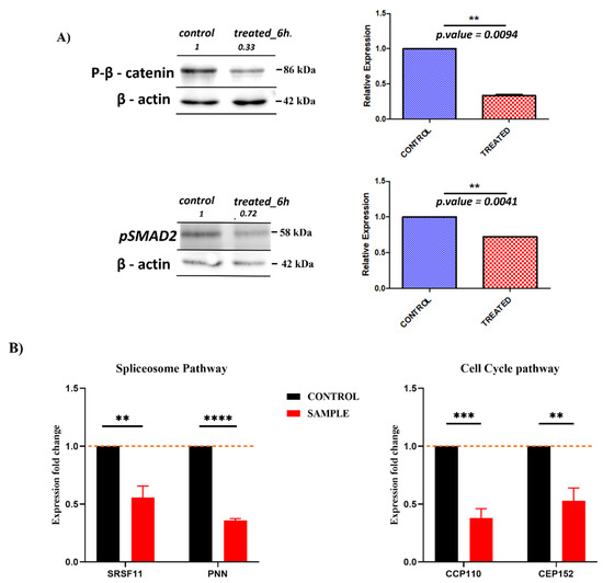 Based on the integrated bioinformatics analysis, we focused on overlapping pathways that showed up both in GSEA and CMAP analysis. Our first question was whether the transcriptome analysis could predict known anti-cancer activities of SSRE, and thus we focused on pathways relevant to tumor growth and cancer progression. To validate the effects of the extract on cancer-related pathways, inhibition of the WNT/Beta-catenin pathway and TGF-beta signaling was tested by immunoblotting with main intracellular signaling elements anti-phospho-β-catenin and anti-SMAD2 antibodies, respectively. The phospho-β-catenin level was reduced upon exposure to extract, reflecting its degradation (Figure 3A). Similarly, the level of SMAD2 was reduced after the administration of the extract (Figure 3A). Thus, both upstream signaling elements of the pathways and downstream gene expression changes were downregulated upon exposure of cells to the extract. We also validated the effects of the extract on the expression of the centrosome (part of the G2/M pathway) and spliceosome genes by RT-PCR (Figure 3B).