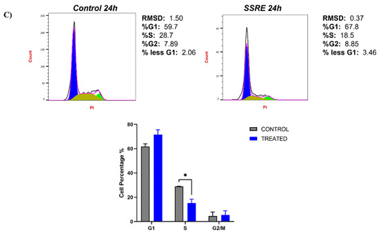 One of the crucial genes involved in cell cycle progression is c-Myc. The altering expression of c-Myc is indicative of cell proliferation as well as the progression through the G1 phase [34,35]. Downregulation of c-Myc can lead to G1 arrest, while inhibition of the G2/M checkpoint to the G2/M arrest [35,36]. Therefore, the prediction based on the pathway analysis was that the extract might cause suppression of both the G1 and G2 phases of the cell cycle. Indeed, FACS analysis of naïve cells and cells treated with the extract indicated depression in S-phase and an increase in G1 cell populations (Figure 3C).
