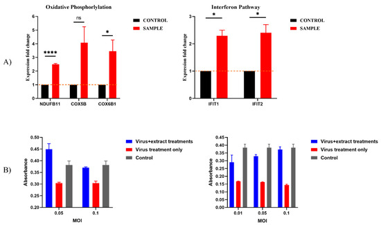 Sarcopoterium spinosum L. extract activates the anti-viral response. (A) Real-Time PCR measurement of mitochondrial (NDUFB11, COX5B, COX6B1) and γ-interferon-induced genes (IFIT1, IFIT2). *, p < 0.05; **** p < 0.001 (treated (sample) vs. control). (B) The extract protects from the SARS-CoV-2 infection. Cells were pretreated with extract for 4 h, then SARS-CoV-2 virus was added to the cells, cell viability was measured by the MTT assay after 48 h. On the right viability of VERO6 cells, on the left viability of A549 cells have been described. Black—untreated control, Red—virus treatment only, Blue—virus + extract treatments.