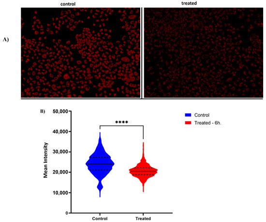 Measurement of mitochondrial content in A549 cells. A549 cells were treated with SSE (200 μg/mL) for 6 h. Fluorescence intensities of Mito-Tracker Red were quantified. Treatment with SSE reduces the number of mitochondria in cells. (A). Representative immunofluorescence images. The intensity of the fluorescent dye in each cell represents the amount of mitochondrial mass. Lower intensity of fluorescence MitoRed dye in treated cells compared to untreated cells demonstrates reduced mitochondria content (B). Violin plot demonstrates the difference in mitochondrial content between untreated (blue) and treated (red) samples. On the Y-axis Mean Intensity of the mitochondrial mass of the cells has been shown. Low intensity indicates fewer mitochondria inside the cells. ****, p < 0.001.