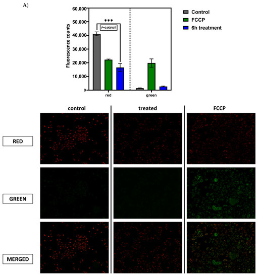 A549 cells were seeded as previously described. The cells were treated with 200 μg/mL extract for 6 h and stained with JC-1 (Abcam) according to the manufacturer’s instructions. Representative images were obtained under a Zeiss confocal microscope equipped with a laser diode 488 nm and 555 nm.
