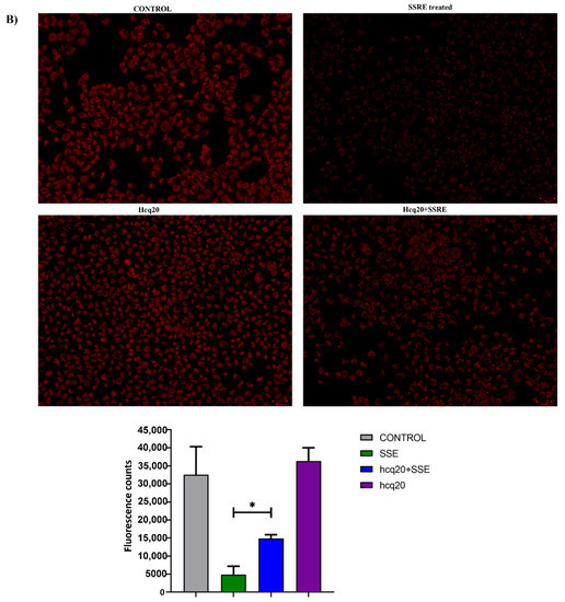Compensatory activity of SSRE through oxidative-phosphorylation pathway. (A) Mitochondrial membrane potential assay. A549 cells were treated with 200 μg/mL extract for 6 h and stained with JC-1. Changes in mitochondrial membrane potential were detected using a JC-1 assay kit containing the cationic dye, which undergoes a readily detectable shift from red to green with decreases in membrane potential. The left panel of the bar graph (red—number of healthy mitochondria) describes a degradation of mitochondria after treatment with the extract. On the right panel (green—the number of unhealthy mitochondria), the level of damaging of the membrane potential of mitochondria after administration of extract was shown. Microscopy images demonstrate the number of mitochondria inside the cells in red, unhealthy mitochondria shown as green in A549 cells before and after exposure to SSE extract. FCCP (mitochondrial oxidative phosphorylation uncoupler) was used as a positive control which damages mitochondrial membrane potential. (B) Mitochondrial autophagic degradation assay. Representative immunofluorescence images using a confocal microscope. A549 were treated with 200 μg/mL extract and/or with autophagy inhibitor hcq (blocker of the lysosomal H+-ATPases hydroxychloroquine) with or without SSE administration for 6 h and stained with JC-1. The intensity of fluorescent dye represents the amount of mitochondrial content inside the cells. The bar graph indicates the statistical difference in the mitochondrial content of A549 cells. Imaging results are representative of three biological replicates (n = 3). ***, p < 0.005, *, p < 0.05.