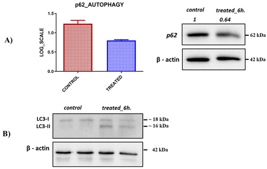 Activation of autophagic pathway. Effect of autophagy on p62 and LC3A/B protein level. (A) A decrease in the p62 protein level after treatment with the plant extract. (B) Increased level of LC3A/B following treatment with the extract. Cells were either treated or untreated with the extract for 6 h.