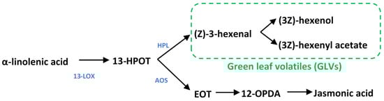 - Matsui, K. Green leaf volatiles: Hydroperoxide lyase pathway of oxylipin metabolism. Curr. Opin. Plant Biol. 2006, 9, 274–280. [Google Scholar] [CrossRef] [PubMed]