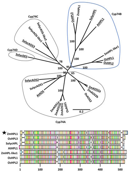 2.1. Phylogenetic Analysis Reveals That ZmHPL1 Clusters with Known HPLs from Other Species