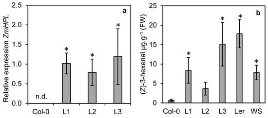 2.2. ZmHPL1 Restores (Z)-3-Hexenal Production in Arabidopsis AtHPL1 Loss-of-Function Plants