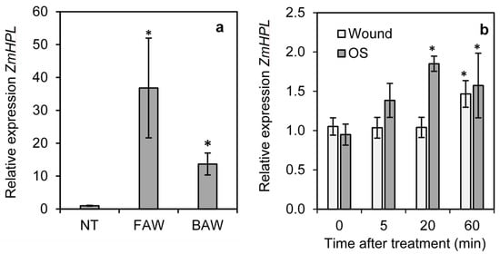 2.3. Wounding and Herbivory Induce ZmHPL1 Expression in Maize