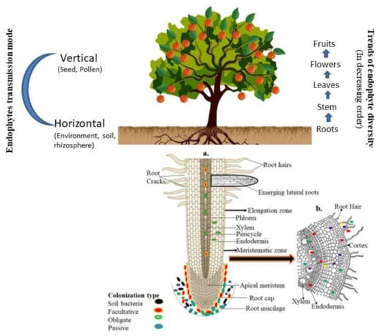 The detailed overview of endophyte biology and their mode of transmission: (a) entry of microbial endophytes to the plant tissue by different part of root zones. Arrows show the movement of endophytes; (b) occurrence of endophytes either at the entry site or in the intercellular spaces. Part of a figure has been taken from Kumar et al. [32].