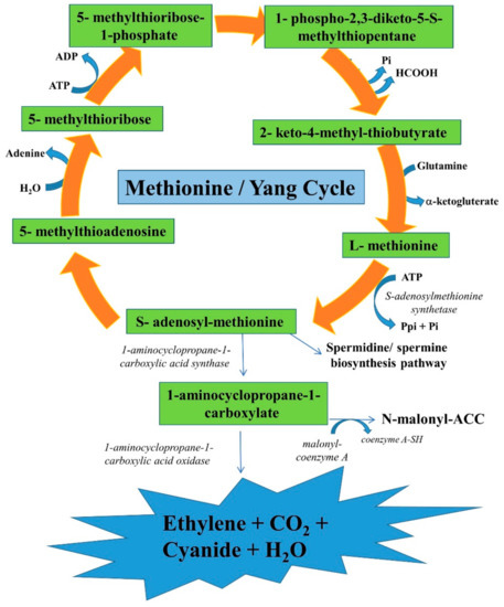 Ethylene biosynthesis with the methionine precursor and the intermediate synthesized as 1-aminocylopropane-1-carboxylic acid (ACC) in higher plants through the Methionine/Yang cycle. Ethylene biosynthesis is the conversion of S-adenosyl-methionine (SAM) from methionine to ACC by ACC synthase (ACS). Methionine is reproduced within the Yang cycle. The Yang cycle is a set of reactions that recycle 5-methylthioadenosine to methionine.