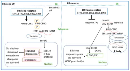 Ethylene signaling is well known to regulate plant growth and development. This signaling was predominantly delineated with research on Arabidopsis thaliana, and the information from Arabidopsis about ethylene signaling is usually applied to other plant species [64]. In Arabidopsis, ethylene is perceived by the family of receptors ETHYLENE RESPONSE1 (ETR1), ETR2, ETHYLENE RESPONSE SENSOR1 (ERS1), ERS2, and ETHYLENE INSENSITIVE4 (EIN4), which act negatively in ethylene signaling, are related to two-component histidine kinase receptors [65,66], and are located at the Golgi and endoplasmic reticulum (ER) membranes [16,67]. Ethylene is a gaseous hormone that may diffuse in both aqueous and lipid environments [10], so its perception does not require a plasma membrane-localized receptor. Several studies have suggested that ethylene receptors are located on the ER membrane [68,69]. Therefore, once ethylene is biosynthesized, it freely diffuses throughout the plants through plasma membranes, reaching the ER, and binds to the ethylene receptors anchored in the ER membrane to stimulate ethylene responses. In ethylene’s absence, ethylene receptors activate the CONSTITUTIVE TRIPLE RESPONSE1 (CTR1), a Raf-like Ser/Thr protein kinase [70,71]. Interestingly, CTR1 phosphorylates the C-terminal end of EIN2 (EIN2-CEND) and turns off EIN2, an ER-localized membrane protein. The mRNAs for F-box proteins, EBF1 and EBF2, are translated in the cytosol and target the master transcriptional regulators of ethylene signaling, EIN3 and EIN3-LIKE1 (EIL1), to proteasomes for protein turnover in the nucleus. Thus, no ethylene-stimulated transcriptional responses are activated. In the presence of ethylene, ethylene binding to their receptors shuts off, and CTR1 becomes inactivated, EIN2 is dephosphorylated and cleaved, and it releases C-terminus (EIN2-CEND), which enters the cytosol (moves to P-bodies) and nucleus. In the cytosol, EIN2-CEND represses the translation of EIN3 BINDING F-BOX PROTEIN1 (EBF1) and EBF2 transcripts by directly or indirectly binding to their 3′-untranslated regions (3′-UTRs) and moving along with these transcripts to the P-bodies [72,73]. In the nucleus, EIN2-CEND directly or indirectly promotes the activity of EIN3 and EIL1. Ethylene stabilizes the EIN3/EIL1 transcription factors and regulates the transcription of ethylene-responsive target genes, such as ETHYLENE RESPONSE FACTOR (ERF) [22,74,75]. It was reported that a gene from the ERF family (isolated from tomato), LeERF1, positively modulates the ethylene triple response on etiolated seedlings, plant development, fruit ripening, and softening, as it was shown that LeERF1 is used transgenically in tomato of sense LeERF1 (LeERF1-sn), wild type, and transgenic tomato of anti-sense LeERF1 (LeERF1-as) tomato [76].