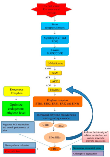Several studies have shown that ethylene biosynthesis is significantly induced during fruit ripening, leaf senescence, or under environmental stresses [3,6]. The enzymes 1-aminocyclopropane-1-carboxylic acid (ACC) synthases (ACSs) and ACC oxidases (ACOs) are considered to be the key biosynthetic enzymes that are responsible for ethylene biosynthesis [3]. Ethylene initiates a cascade of adaptive responses in plants under optimal and stressful states. However, the literature does not provide collective information on the induction mechanism of stress ethylene by the influence of environmental stresses or the sources of ethylene production and its exogenous application for stress acclimatization.