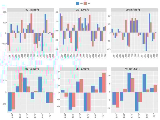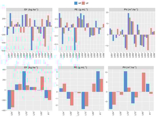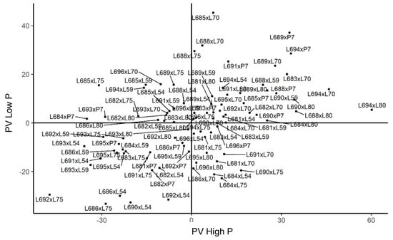 Still considering the PV, among the testers investigated, lines L70, P7, and L59 prevailed in the environment of high phosphorus levels in the soil, having shown positive ĝi results, whereas in phosphorus-limiting conditions, only two stood out—L80 and L70. Among the genotypes with good results, tester line L70, from the BRS Angela population, distinguished itself by having positive values for PV at both phosphorus levels in Campos dos Goytacazes (Figure 1). These results agree with the work of Schmitt et al. [42], who reported the good performance of the parent L70 in presenting a positive ĝi estimate for PE.