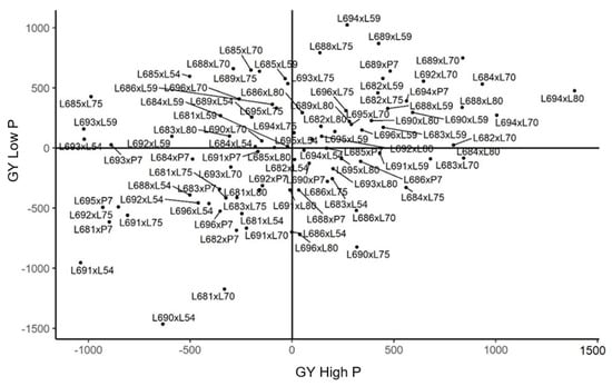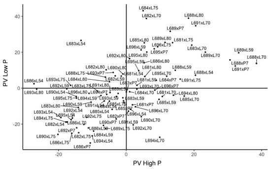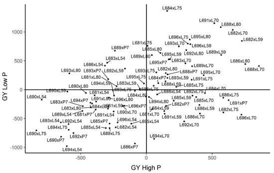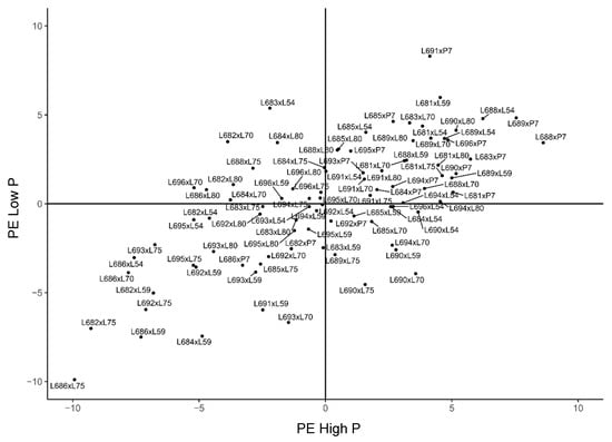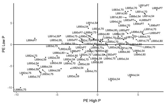 Regarding the genetic merit of the hybrids tested in the environments, it was found that the combination L688 × P7 presented favorable alleles for the highest expression of PE, in addition to having good phenotypic plasticity, since it ranked well in both growing conditions. Among the hybrids with the best performance in the environment with phosphorus supplementation, the following combinations can be considered: L688 × P7, L696 × P7, and L690 × L80. As for the environment without a phosphate fertilizer supply, the hybrids ranking highest were L91 × P7, L685 × L70, and L688 × P7 (Figure 6). The good performance of the tester P7, which was in the best hybrid combinations and expressed the highest ĝi estimates in both high and low P level environments, should again be noted.