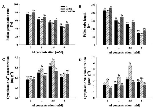 The cytoplasmic Al3+ concentration in the pollen tubes was measured as described by Havlin and Soltanpour with slight modifications []. Briefly, oven-dried and ground 100 mg pollen tube samples were digested with 5 mL of HNO3 and analyzed using inductively coupled plasma optical emission spectrometry (ICP-OES, iCAP 7400, Thermo Fisher, Waltham, MA, USA). The cytoplasmic NO concentration in pollen tubes were determined according to the operating instructions provided in the NO determination kit (Beyotime Biotechnology, Shanghai, China, Cat No. S0023).