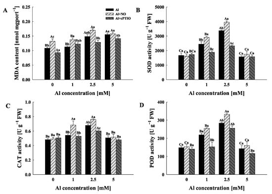 The effects of different treatments on the malondialdehyde (MDA) contents (A), superoxide dismutase (SOD) (B), catalase (CAT) (C) and peroxidase (POD) (D) activities of Camellia sinensis pollen tubes. FW: fresh weight. Al represents the treatment group treated with Al concentration gradient only, Al + NO represents the treatment group treated with Al3+ concentration gradient treatment and 25 μM DEA NONOate (NO donor), and Al + cPTIO represents the treatment group treated with Al3+ concentration gradient treatment and 200 μM carboxy PTIO potassium salt (NO scavenger). Different lowercase letters represent significant differences among different nitric oxide conditions under the same Al3+ concentration treatment, and different uppercase letters represent significant differences among different Al3+ concentration treatments under the same nitric oxide condition (n = 3, p < 0.05), as determined by the Duncan test.