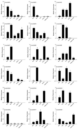 The expression level of CsALMTs in different tissues of Camellia sinensis. Different lowercase letters represent significant differences among different tissues (n = 3, p < 0.05), as determined by the Duncan test.