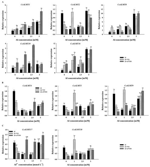 The expression levels of CsALMT4, 5 and 9 in subclass II did not show an obvious trend along the Al concentration gradient (Figure 4). However, it should be noted that the expression levels of CsALMT4 and CsALMT9 in Al0 + NO and Al0 + cPTIO were significantly lower than those of Al0. Similar to CsALMT4 and CsALMT9, the expression levels of CsALMT17 and CsALMT18 were significantly lower than those of the control under normal cytoplasmic Al3+ concentration after the addition of the NO donor and NO scavenger. Moreover, the expression levels of CsALMT17 in Al + cPTIO were significantly higher than those of the other two treatment groups after the addition of Al3+. However, for CsALMT18, only the expression level in Al1 + NO was significantly higher than that in Al1 and Al1 + cPTIO.