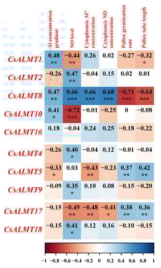 The modified (the data under 5 mM Al3+ treatment were removed) Pearson correlation coefficients between Al3+ concentration gradient and NO level in the culture medium, cytoplasmic Al3+ and NO concentration, pollen germination rates, pollen tube lengths and CsALMTs expression levels. Significant differences are reported as * (0.01 < p < 0.05), ** (0.001 < p < 0.01) and *** (p < 0.001), as determined by the Duncan test.