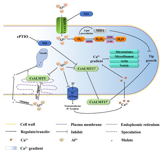 According to the results of this study, based on the comprehensive study of Al toxicity and tolerance in plants, the fundamental signal regulation network mainly relies on the NO and CsALMTs regulated, and their crosstalk is shown in Figure 6. On the one hand, CsALMT8 localized on the plasma membrane can sense Al3+ outside pollen tubes and promote the uptake of Al3+, and this process is positively regulated by NO signaling molecules. After Al3+ enters the pollen tube, it accelerates the production of ROS, such as superoxide anions (·O2-), and then leads to programmed cell death through lipid peroxidation. These ROS are gradually converted into H2O2 and H2O under the action of SOD, POD and CAT. On the other hand, CsALMT5 is negatively regulated both by the extracellular Al concentration gradient signal and cytoplasmic Al3+ concentration, which may hinder malate efflux from vacuoles, further weaken the chelation and fixation of Al3+ by extracellular malate and finally inhibit the growth of C. sinensis pollen tube. CsALMT17 encodes an extracellular protein that is synthesized and secreted by cells and its expression level was negatively regulated by NO signaling molecules and cytoplasmic Al3+, and can promote the growth of C. sinensis pollen tube. In addition, Al3+ readily reacts with the negatively charged plasma membrane and ultimately disrupts the uptake of mineral ions, such as Ca2+ []. Additionally, it then affects the Ca2+ concentration gradient, which acts as an important factor regulating the polar growth of C. sinensis pollen tubes.
