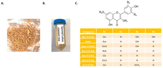 Pictures of sacred lotus (N. nucifera) stamen (A) and tea obtained after traditional infusion (B) and chemical structures of its main flavonoids (C) Myr-3-O-Glc: myricetin-3-O-glucose; Quer-3-O-Rut: quercetin-3-O-rutinoside (rutin); Quer-3-O-GlcA: quercetin-3-O-glucuronic acid; Kae-3-O-Rob: kaempferol-3-O-robinobiose; Kae-3-O-Glc: kaempferol-3-O-glucose; Kae 3-O-GlcA: kaempferol 3-O-glucuronic acid; Iso-3-O-Glc: isorhamnetin-3-O-glucose; Glc: glucose; GlcA: glucuronic acid; Rob: robinobiose.