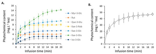 Sacred Lotus stamen tea contains antioxidant flavonoid glycosides [18,21], including kaempferol (Kae) (Kae-3-GlcA, Kae-3-Glc, and Kae-3-Rob), myricetin (Myr-3-Glc), quercetin (Rutin and Quer-3-Glu), and isorhamnetin (Iso-3-Glc) (Figure 1). All compounds studied in this study are water soluble and are thought to actively contribute to the health-promoting antioxidant effects of sacred lotus stamen tea [18,21]. During infusion, most compounds are rapidly extracted and their concentrations reached a plateau after 5 min, with the exception of Kae-3-GlcA, the main flavonoid extracted from sacred lotus stamen, whose extraction kinetic reached a plateau only after ca. 12 min of infusion (Figure 2A). The release kinetics of these compounds appear to be proportional to their amounts. Because the concentrations reached are all far from their limits of solubility in water (e.g., rutin solubility in water is 125 mg/L, compared to 4.83 mg/L in sacred lotus stamen tea), solubility did not appear to be a limitation parameter. On the other hand, the temperature is known to affect the solubility of flavonoids in water [40]. Here, the temperature dropped from 100 °C to ca. 75 °C during the 20 min infusion, but this parameter did not appear to be critical, as two successive infusions of 10 min with boiled water produced very similar kinetic results (data not shown). Because Kae-3-GlcA is more abundant, the total flavonoid content extraction kinetics logically followed the same trends (Figure 2B).