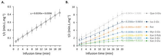Second=order kinetics were used to fit the concentrations of total flavonoids and each individual flavonoid glycoside that was obtained during the infusion of sacred lotus tea. For each compound under investigation, linear curves (R2 > 0.99) for time (t) against time/concentration (t/C) were obtained (Figure 3). It is worth noting that the same second-order kinetics have previously been observed for the extraction of phenolics and caffeine from green tea [39], as well as phenolics from wild olive leaves [41]. The extraction capacity (Cꚙ) and the second-order extraction rate (k1) were calculated using the slope and intercept of each linear function. These kinetic parameters were determined from data collected during the first 5 min of the infusion under the assumption that the effect of a change in temperature would be minimal. These calculated values of Cꚙ and k1, as well as the observed experimental extraction capacity after 20 min of infusion (C20exp), are listed in Table 1. Remarkably, the k1 values of flavonoid diglycosides (rutin and Kae-3-Rob) were higher than those of the flavonoid monoglycosides. Similarly, the difference between their Cꚙ and the experimental extraction capacity observed 20 min after infusion (C20exp) were minimal for these two flavonoid diglycosides when compared to the other flavonoid monoglycosides (Table 1). Because of their higher water solubility, these two compounds may be more effectively extracted. However, no significant differences in Cꚙ and C20exp values were observed, indicating that all individual flavonoids and total flavonoids were efficiently extracted over the 20 min infusion.