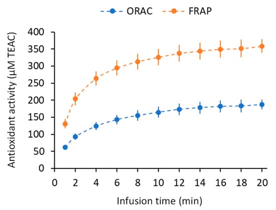 The large part of the medicinal value of sacred lotus stamen tea is attributed to its antioxidant capacity [18]. Here, the ORAC (oxygen radical absorbance capacity) assay and the FRAP (ferric reducing antioxidant power) assay, which rely on antioxidant mechanisms based on hydrogen atom transfer (HAT) and electron transfer (ET), respectively [42], were used to assess the antioxidant capacity kinetics of sacred lotus tea as a function of infusion time. The antioxidant capacity of sacred lotus tea increased with infusion time, reaching a plateau after 12 min (Figure 4). The results suggested that the antioxidant capacity of sacred lotus tea mainly relied on an ET-based mechanism rather than a HAT-based mechanism, with results of FRAP being higher than that of ORAC assay. Similarly, it has been observed that stamen ethanolic extract of N. nucifera displayed a high ET-based antioxidant capacity [21]. In addition, our recent work at least suggests that this observed antioxidant capacity of sacred lotus stamen was also obtained in eukaryotic cellular model (yeast cell) [37]. Furthermore, a stronger correlation between the ET-based mechanism and some flavonoids has previously been reported [42,43].