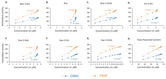 Correlation of antioxidant activity (ORAC (blue line) and FRAP (orange line) assays) with the concentration of Myr-3-Glc (A), Rut (B), Que-3-GlcA (C), Iso-3-Glc (D), Kae-3-Rob (E), Kae-3-Glc (F), Kae-3-GlcA (G) and total flavonoids (H). Myr-3-O-Glc: myricetin-3-O-glucose; Quer-3-O-Rut: quercetin-3-O-rutinoside (rutin); Quer-3-O-GlcA: quercetin-3-O-glucuronic acid; Kae-3-O-Rob: kaempferol-3-O-robinobiose; Kae-3-O-Glc: kaempferol-3-O-glucose; Kae 3-O-GlcA: kaempferol 3-O-glucuronic acid; Iso-3-O-Glc: isorhamnetin-3-O-glucose; Glc: glucose; GlcA: glucuronic acid; Rob: robinobiose.