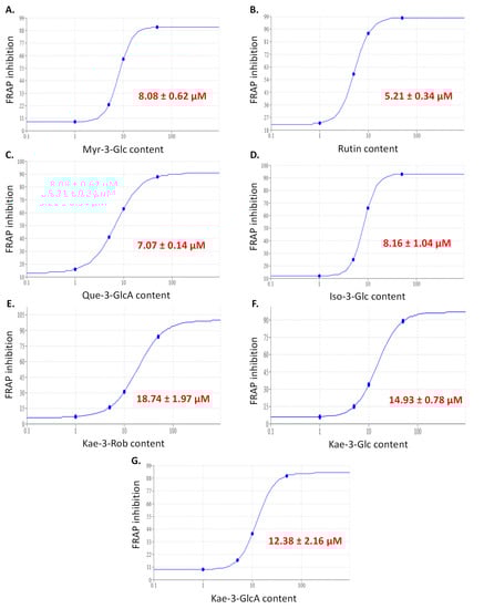 EC50 curves for the FRAP antioxidant activity of Myr-3-Glc (A), Rut (B), Que-3-Glu (C), Iso-3-Glc (D), Kae-3-Rob (E), Kae-3-Glc (F), and Kae-3-Rob (G). Myr-3-O-Glc: myricetin-3-O-glucose; Quer-3-O-Rut: quercetin-3-O-rutinoside (rutin); Quer-3-O-GlcA: quercetin-3-O-glucuronic acid; Kae-3-O-Rob: kaempferol-3-O-robinobiose; Kae-3-O-Glc: kaempferol-3-O-glucose; Kae 3-O-GlcA: kaempferol 3-O-glucuronic acid; Iso-3-O-Glc: isorhamnetin-3-O-glucose; Glc: glucose; GlcA: glucuronic acid; Rob: robinobiose.
