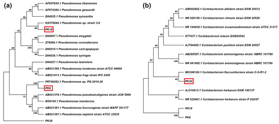 Phylogenetic tree based on 16S rRNA gene sequences of (a) PK6 and PK18 strains identified as Pseudomonas spp. and (b) PK30, identified as Curtobacterium sp. PK30 was used as outgroup for building the Pseudomonas tree, and PK6 and PK18 were used as outgroup for building the Curtobacterium tree.