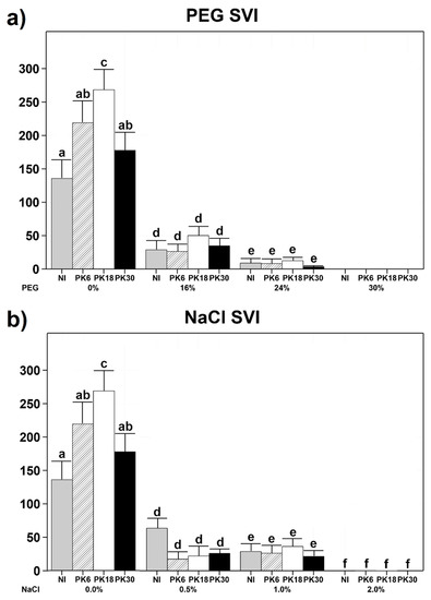 All other strains did not significantly affect T. durum’s development in the same conditions, and no increase in SVI was observed for any bacterial treatment performed at higher PEG or NaCl concentrations (Figure 2).