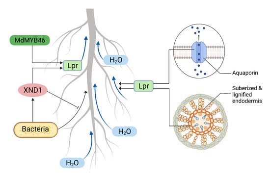 Molecular and cellular regulators of root hydraulics. XND1 reduced root hydraulics (Lpr) by inhibiting xylem formation. Bacteria increase XND1 activity and XND1 reduces the pathogenicity of the bacteria; thus, Lpr is regulated without being affected by bacterial wilt. MdMYB46 influences Lpr by modifying root xylem vessel formation. Aquaporins control Lpr by regulating radial water transport. Suberin reduces Lpr and lignin indirectly reduces Lpr by facilitating xylem vessel development.