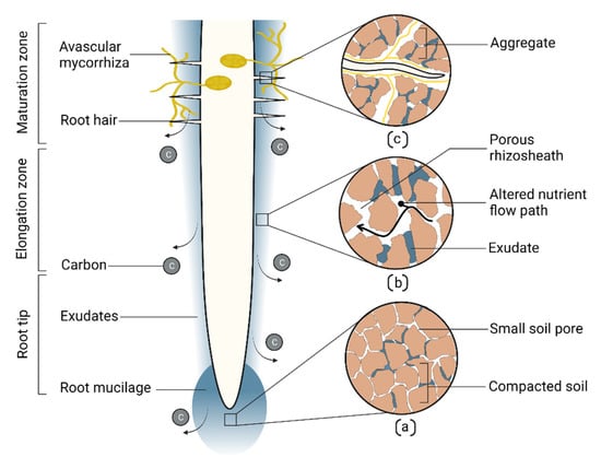 Root soil building attributes. Root exudation releases carbon into the soil. (a) Soil compaction and reduction of pore space in the root tip area. (b) Formation of porous rhizosheath area and altered nutrient flow path due to root mucilage. (c) Soil aggregation by root mucilage, root hair, and avascular mycorrhiza hyphae.