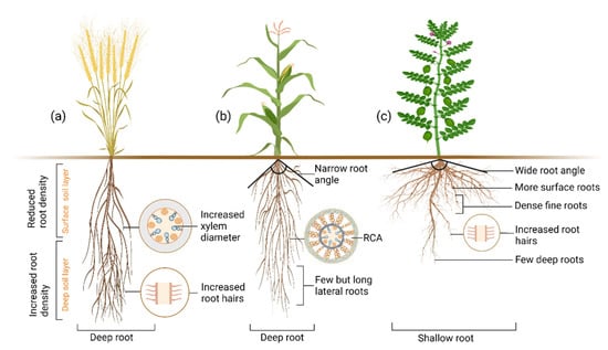 Different drought-adaptive root ideotypes. (a) Deep root, reduced root on soil surface layer, more root in the deep layer, and increased root hair and xylem diameter are crucial drought adaptation response traits (b) Deep root, narrow root angle, few but long lateral roots and more root cortical aerenchyma (RCA) are helpful for drought adaptation. (c) Shallow, wide-angle roots, more dense surface roots but few deep roots, and increased root hairs are the necessary root drought adaptation traits for low rainfall areas.