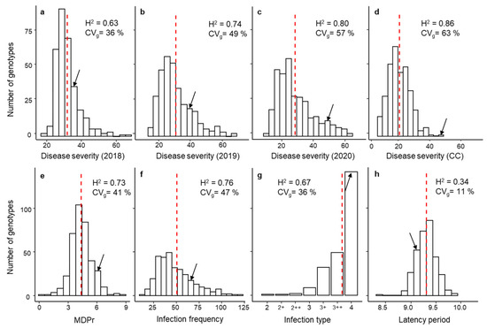 Phenotypic variation in rust response adjusted means (BLUPs) among 320 pea accessions after infection with U. pisi. (a–d) show the DS plants under field conditions during 2018, 2019, and 2020 seasons and DS seedlings under controlled conditions (CC), respectively. (e–h) show seedlings under CC, the monocyclic disease progress rate (MDPr), infection frequency (IF), infection type (IT), and latency period (LP50), respectively. Genotypic coefficient of variation (CVg) and heritability (H2) are also shown. Dashed red lines and black arrows indicate the overall mean and where the susceptible control Messire is located, respectively.