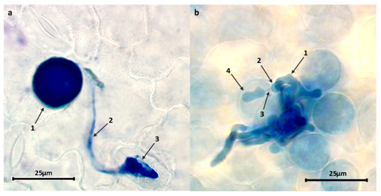 The leaflet samples collected at 2 dpi were bleached on filter paper dipped in fixative solution (absolute ethanol/glacial acetic acid, 1:1, v:v), and then they were boiled in 0.05% trypan blue in lactophenol/ethanol (1:2, v:v) for 10 min. Finally, they were cleared in a nearly saturated aqueous solution of chloral hydrate (5:2, w:v) to remove trypan blue from chloroplastic membranes as described in Sillero and Rubiales [23]. Histological observations were made using a phase contrast Leica DM LS microscope at ×400 magnification. Assessments were based on the observation of 25 random infection units per leaflet with three independent replicated leaflets per accession. For each infection unit, the number of hyphal tips and haustoria were counted allowing estimation of the early abortion rate (colonies without haustoria). Presence or absence of host cell necrosis associated to the infection units was also noted through the detection of autofluorescence upon cell excitation by UV light. The colony size, including perimeter and area, was also determined using a Levenhuk M1400 PLUS camera and LevenhukLite software.