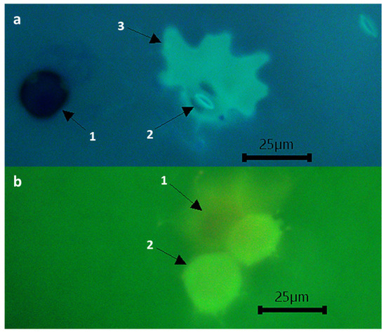 Different cells attacked by U. pisi colonies in PI273209 accession: (a) Epidermic tissue visualized with fluorescent blue filter at 48 h post inoculation showing a germinated urediospore (1), the stoma (2), and a dying epidermal cell (3); (b) Mesophyll tissue visualized with fluorescent green filter showing the substomatal space (1) and two dying mesophyll cells (2).