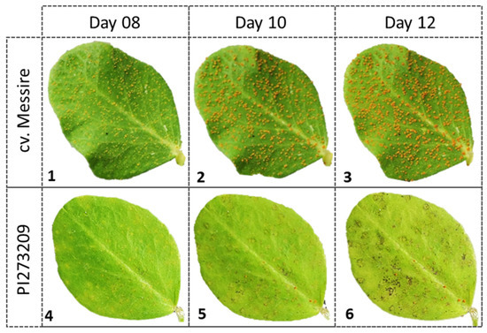 Rust symptoms progression in cv. Messire and PI273209 accession leaves. (1–3) show the macroscopic rust progression in cv. Messire at 8, 10, and 12 dpi, respectively. (4–6) show the macroscopic rust progression in PI273209 accession at 8, 10, and 12 dpi, respectively.