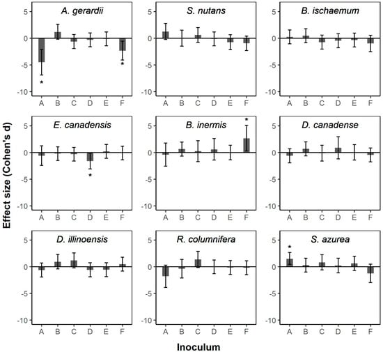 Effect sizes (Cohen’s d) of commercial arbuscular mycorrhizal (AM) fungal inoculants on total biomass productions of nine plant species commonly found in central North American grasslands (Andropogon gerardii; Sorghastrum nutans; Bothriochloa ischaemum (invasive); Elymus canadensis; Bromus inermis (invasive); Desmodium canadense; Desmanthus illinoensis; Ratibida columnifera; Salvia azurea). Descriptions of inoculums A–F are given in Table 2. Error bars represent 95% confidence intervals. Asterisks indicate significant effect sizes, as determined when confidence intervals did not overlap zero.