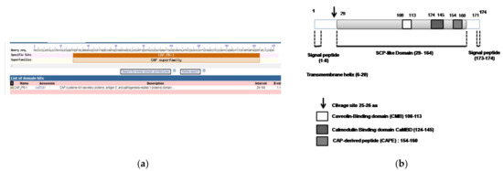 Bioinformatic analysis of AvPR-1 structure. (a) Analysis of AvPR-1 proteins using the NCBI server showed that AvPR-1 belongs to the CAP superfamily. (b) Conserved domains of the AvPR-1 protein. The predicted AvPR-1 protein contained a conserved motif at residues 29–164 aa that belonged to the CAP-superfamily. Two peptide signals were also identified in the N-(1–25) and C-(164–174) terminal parts with the presence of a transmembrane domain. AvPR-1 also contains a cleavage site at position 25.