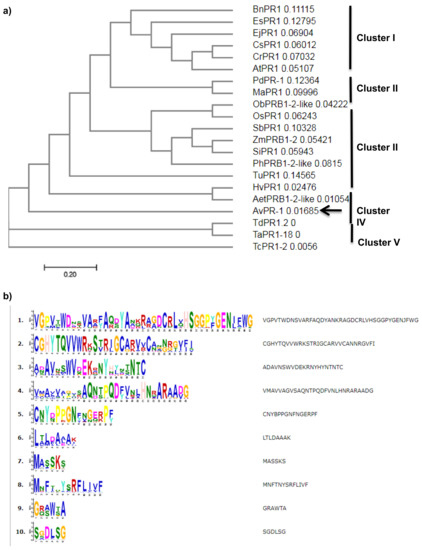 Moreover, phylogenetic tree analysis was performed using the same database through the neighbor-joining method. This resulted in five major clusters, viz. I, II, III, IV and V. As expected, PR1 proteins isolated from dicotyledonous plants were clustered into one group (group I, Figure 3a), whereas proteins isolated from monocotyledons were clustered into four groups. The second group is formed by proteins isolated from Phoenix dactylifera and Musa acuminate. The majority of proteins were clustered into group III, whereas AvPR1 protein was clustered with barley and Aegilops taushii proteins (cluster IV), suggesting an evolutionary conservation of those species and that oat protein may share a common ancestor with those proteins and could perform the same functions. In addition, the last group was formed by proteins isolated from three wheat plants (Figure 3a).