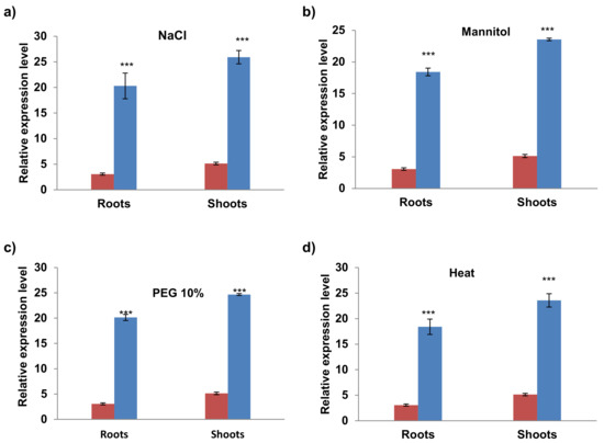 qRT-PCR expression analysis of AvPR-1 gene under different abiotic stresses (a) salt, (b) mannitol, (c) PEG 10%, and (d) heat. The red bars represent the expression level of the AvPR-1 gene under standard conditions, and the blue bars represent the expression level of the AvPR-1 gene under stressed conditions. (***) indicates value significantly different from the control. Statistical significance was assessed by applying the student t-test at p < 0.01.