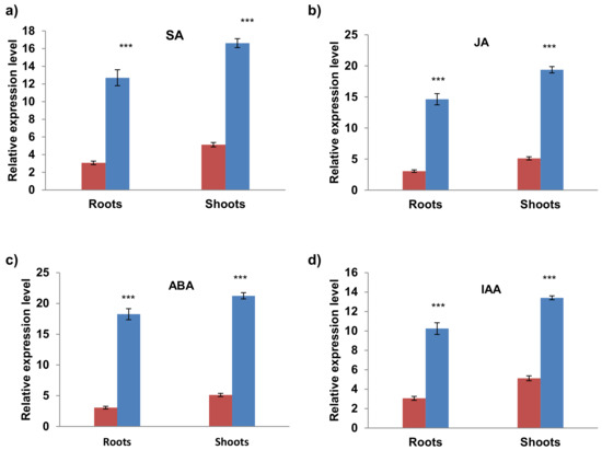 qRT-PCR expression analysis of AvPR-1 gene under different hormonal stresses (a) Salycilic acid (SA) (b) Jasmonic acid (JA) (c) abscisic acid (ABA), and (d) IAA. The red bars represent the expression level of the AvPR-1 gene under standard conditions, and the blue bars represent the expression level of the AvPR-1 gene under stressed conditions. (***) indicates value significantly different from the control. Statistical significance was assessed by applying the student t-test at p < 0.01.