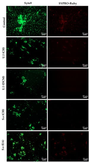 4.3.2. Epifluorescence Microscopic Analysis of Treated Biofilms (Extract Added at t0)