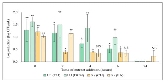 2.1.1. Effect of Extracts on S. aureus Biofilm Formation and Development (Extract Added at t0)