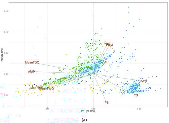 As expected, the highly significantly (p ≤ 0.001) and correlated variables share with each other temperature in their definition (Table 1). For instance (Table 1a), AMT was consistently significantly and positively correlated with the variables MaxTWM (r = 0.79), MeanTDQ (r = 0.71), and MeanTWQ (r = 0.77), similar to MaxTWM with MeanTWQ (r = 0.94). For those based on precipitation, only PDM with PDQ (r = 0.99) exhibited a significant correlation. Similarly, Table 1b shows positive correlations between the variables associated with temperature, such as the case of AMT with the variables MaxT (r = 0.98), HITmead (r = 0.92), and HITmax (r = 0.93); MaxT with HITmead (r = 0.92) and HITmax (r = 0.96); and HITmead with HITmax (r = 0.97). On the other hand, negative correlations were observed only for MeanTDQ with PWQ (r = −0.84) and AP with DI (r = −0.83), which reflect contrasting trends between temperature and precipitation.